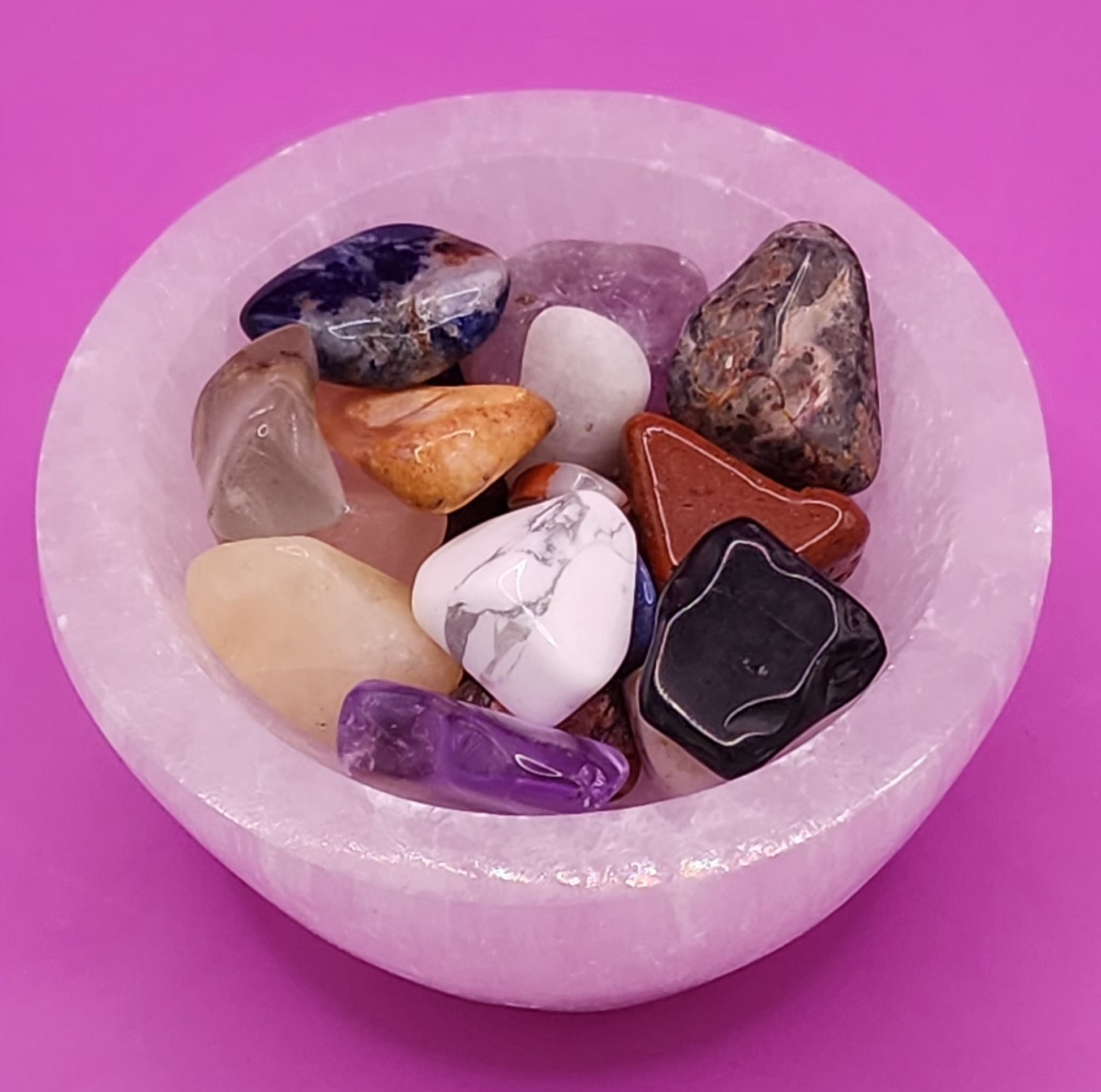 Satin Spar Selenite Bowl with Crystal Tumblestones